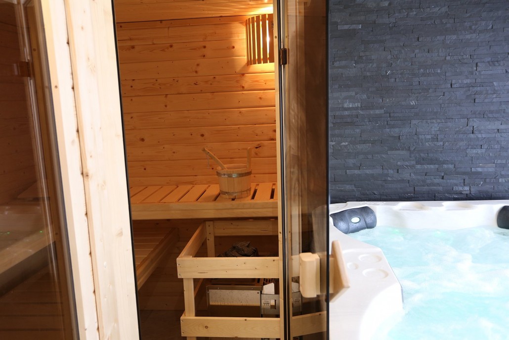 Unique feature – separate indoor spa area with ceiling to floor sliding doors and views over the valley: large corner sauna with ceiling to floor door and window, perfect for savouring in those views; large jacuzzi